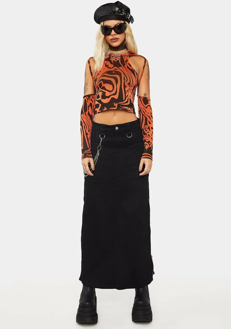 cuz test the limits. This top has a stretchy ribbed material, an all over trippy swirl print, cut out detailing, a wrap design, sleeves, and a cropped fit.