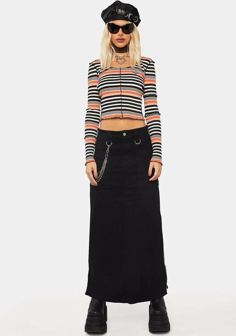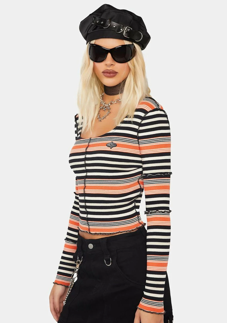cuz you’re in control. This long sleeve crop tee has a stretchy ribbed knit construction, exposed overlock stitching, a scoop neckline, and a rubber logo detail at the chest.