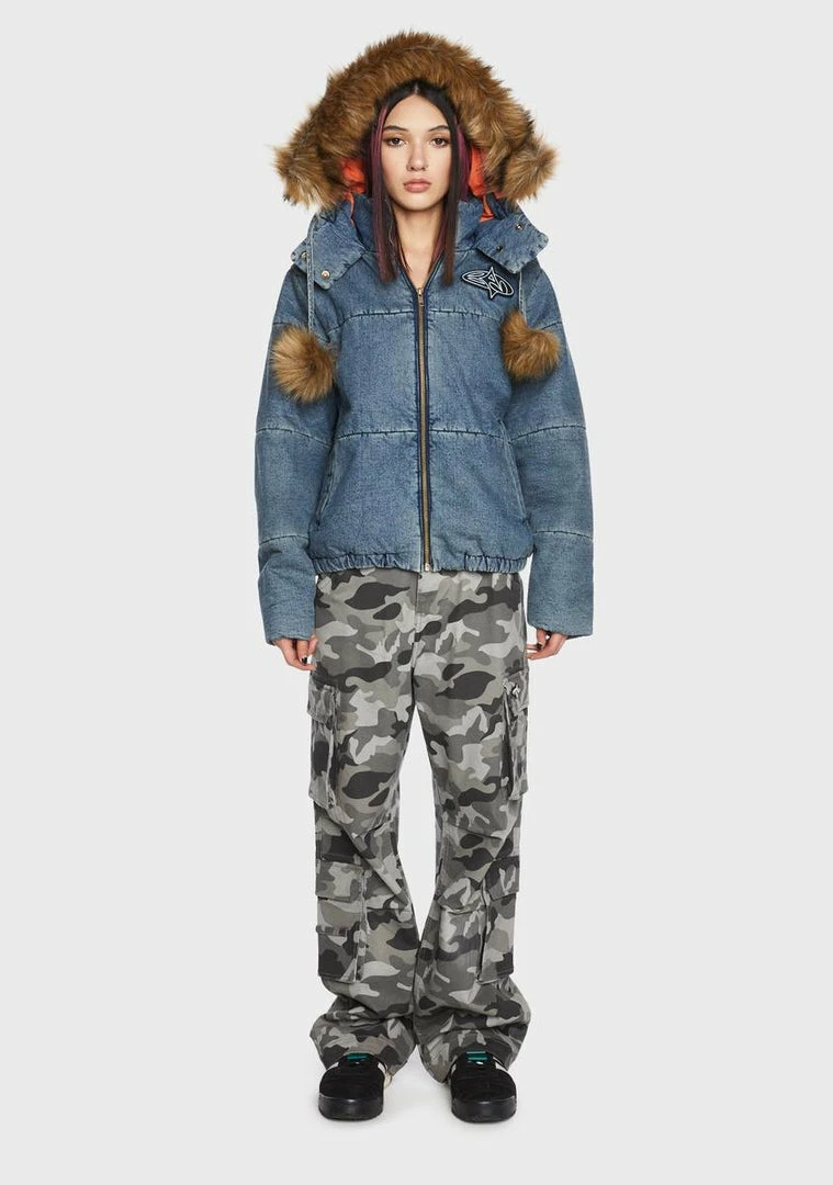cuz you couldn’t care less. This quilted puffer jacket has a denim construction, a hood with contrast-colored lining, faux fur trim and pom poms, long sleeves, a branded rubber gummy badge at the chest, and a front zip closure.