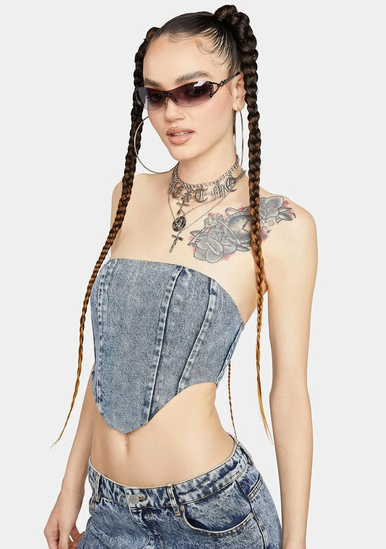 uz I’ll have ya up all night. This corset top has a denim construction, a pointed hem, a cropped fit, and a back zip closure.