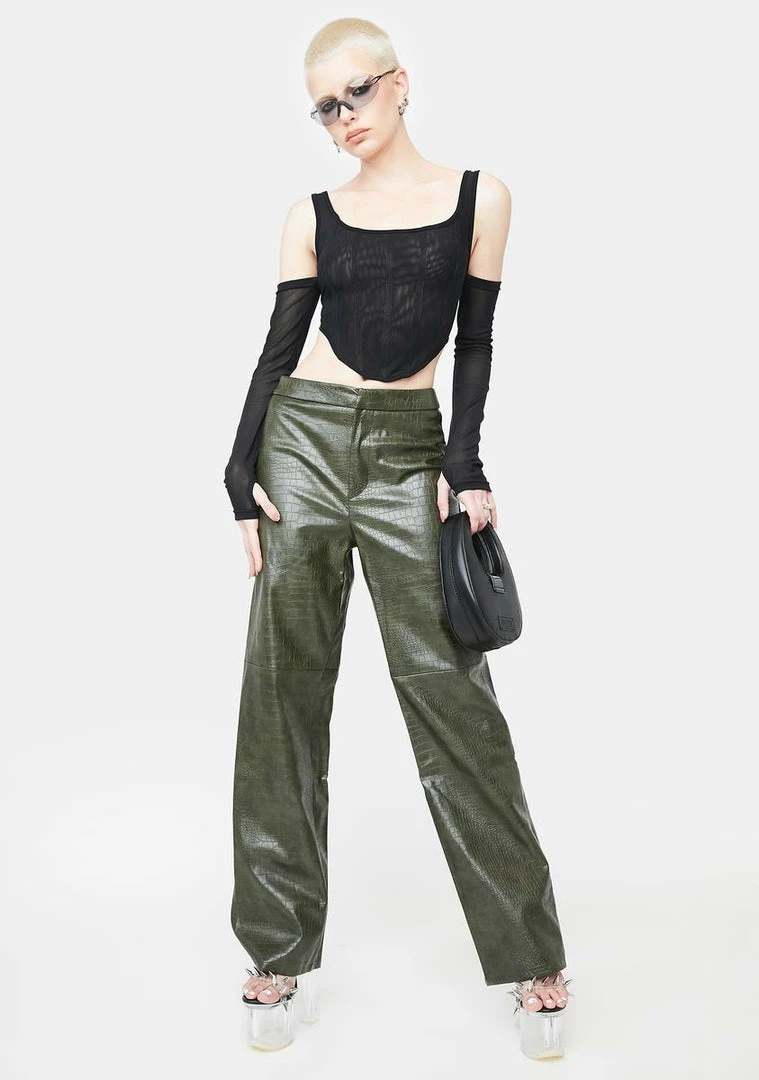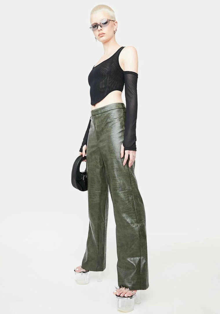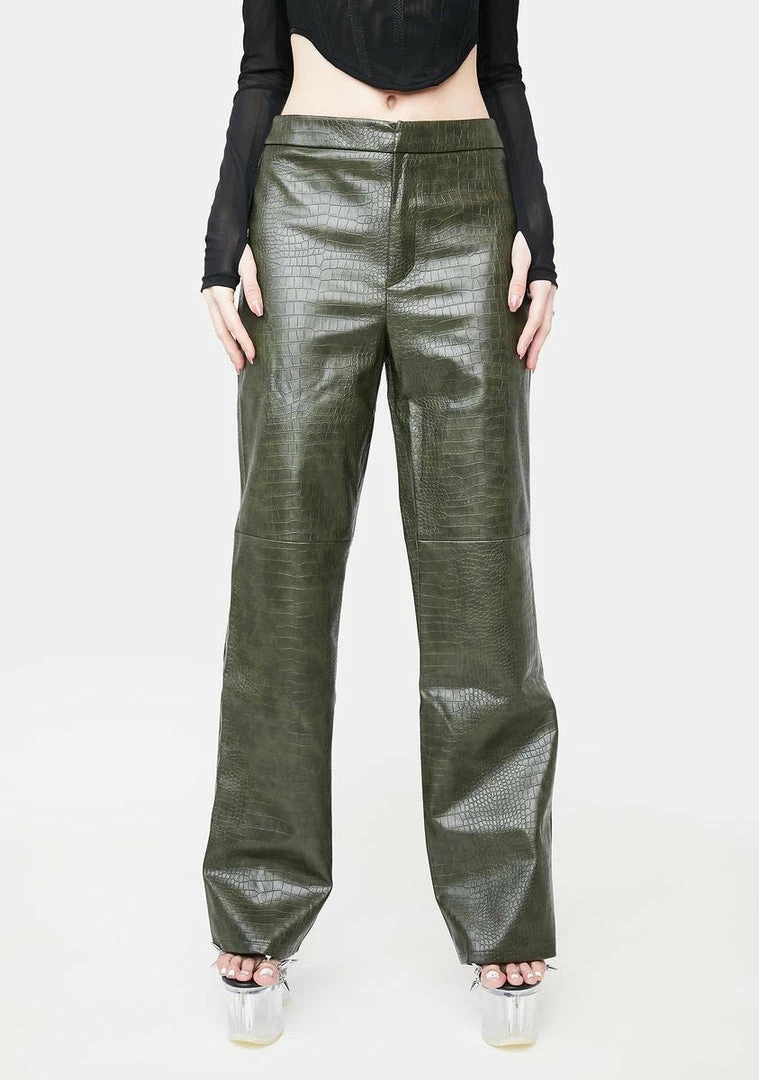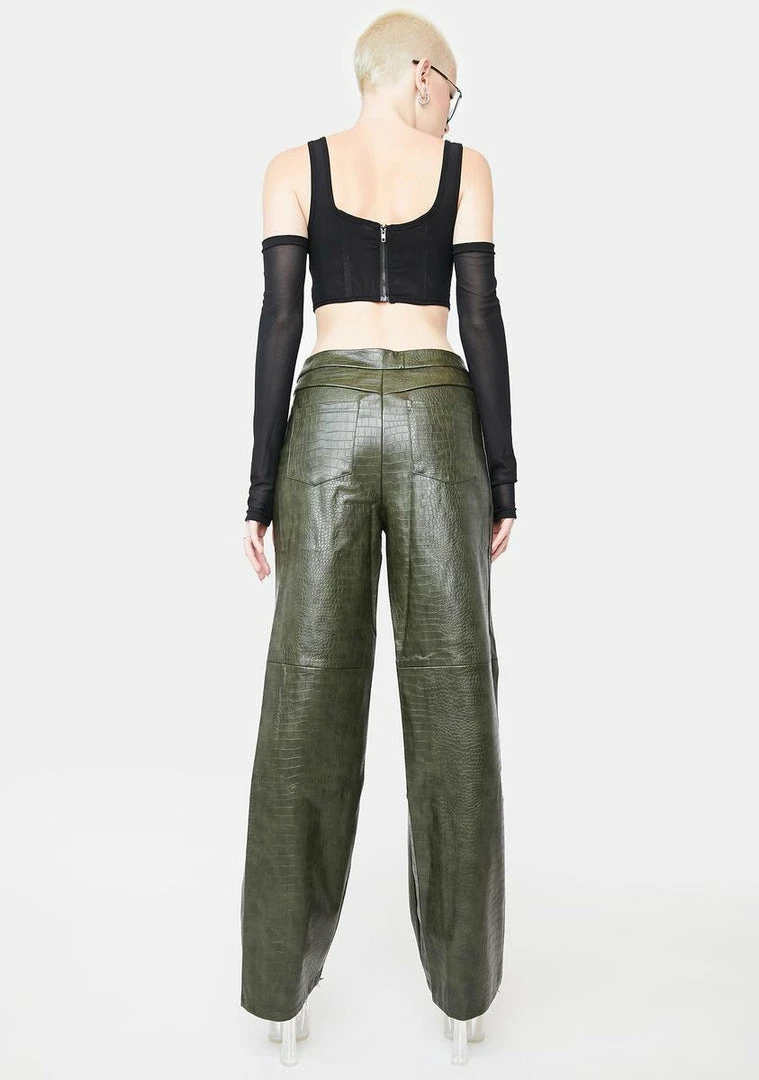 dangerous in dark green. These trousers come in an oversized fit, a vegan croc material, and pockets on the back.