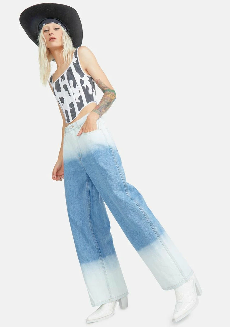 cuz youΓ’ΒΒre not their girl! These wide leg denim jeans have a high waist fit, front and back pockets, and a dip dye ombre design.