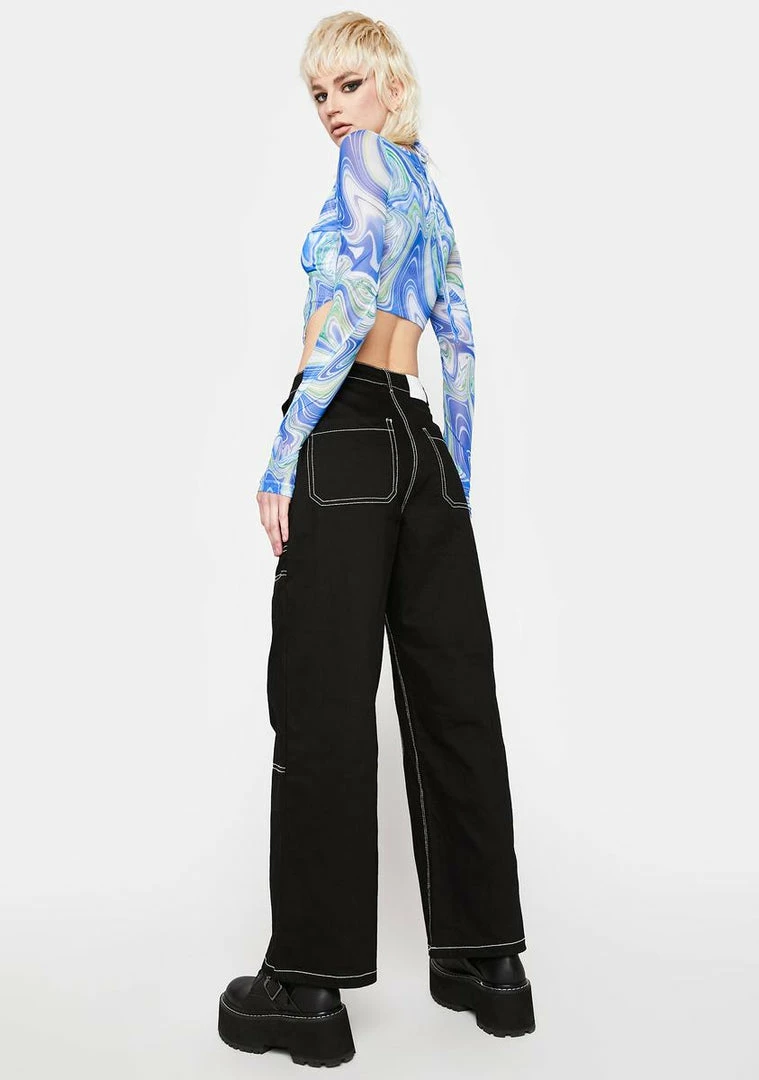 keeping it classic! These denim jeans have a high-rise waist with a zip fly closure, contrast white stitching all over, a brand logo patch on the back, and a wide leg design.