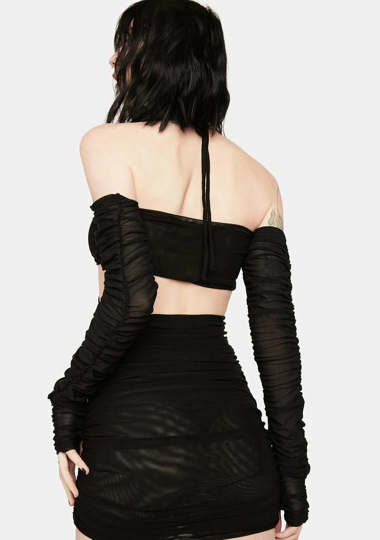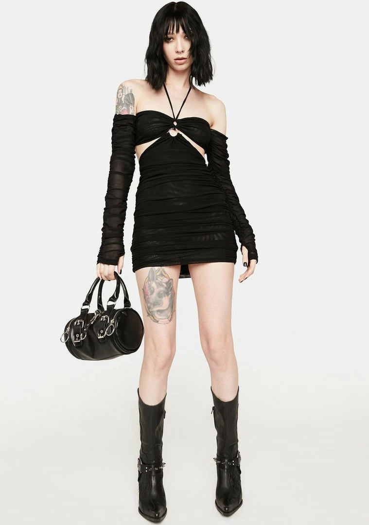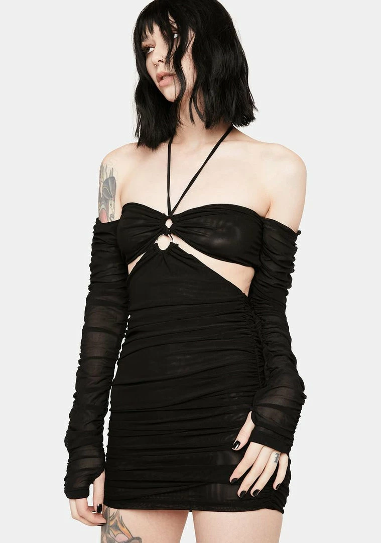 little black dress just walked into the room! This mini dress has a mesh construction, halter ties, off-the-shoulder long sleeves with thumbhole cutouts, cutouts at the waist and across the back, and ruching all over.