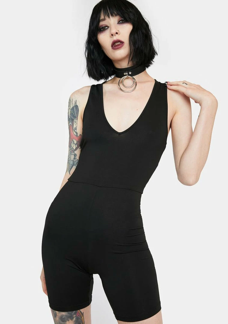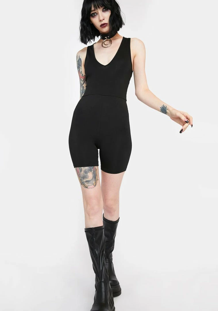 has a stretchy fitted construction, a v neckline with tank straps, mid length shorts, and a dynamic cutout in back.