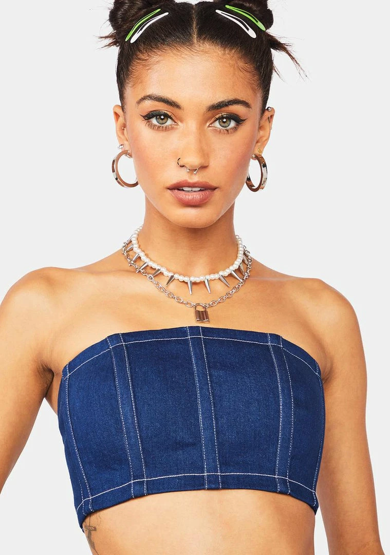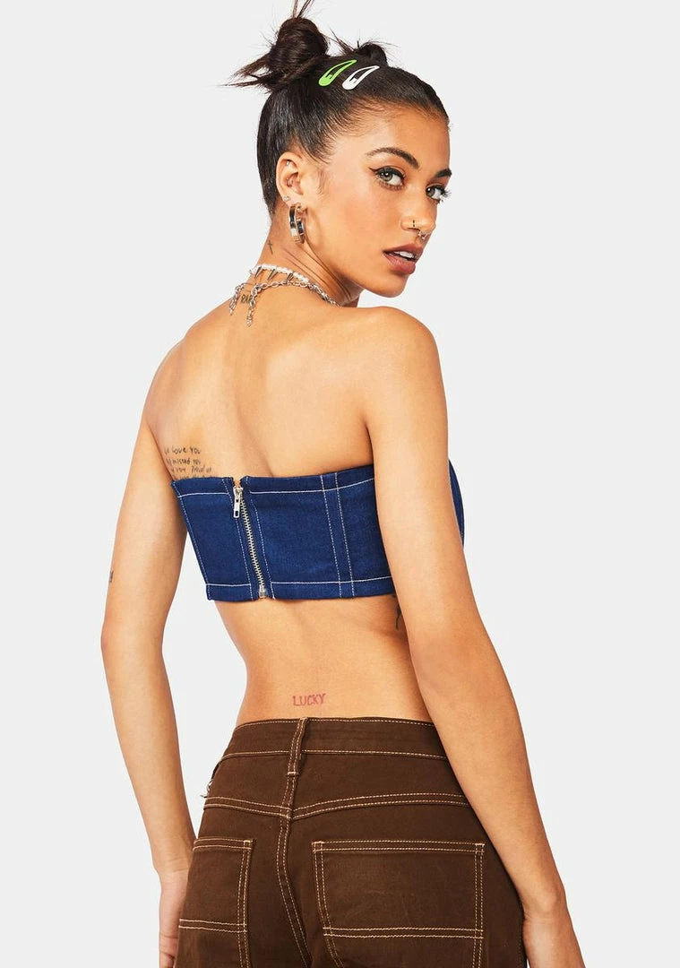 cuz you’re the one to watch. This cropped tube top has a denim construction with contrast stitching and a back zip closure.