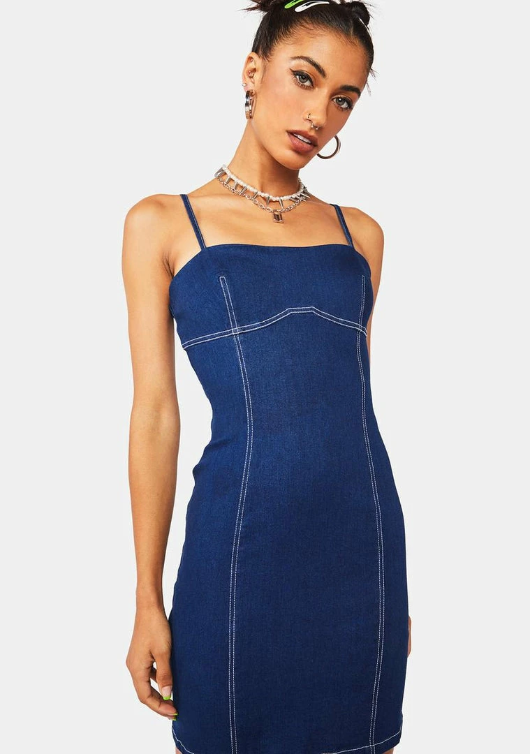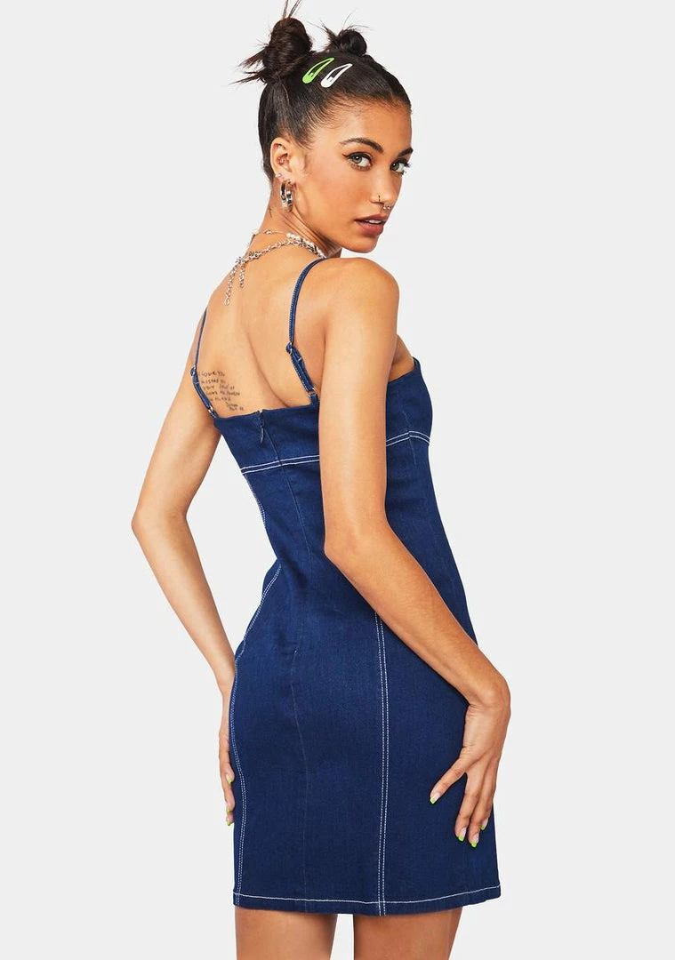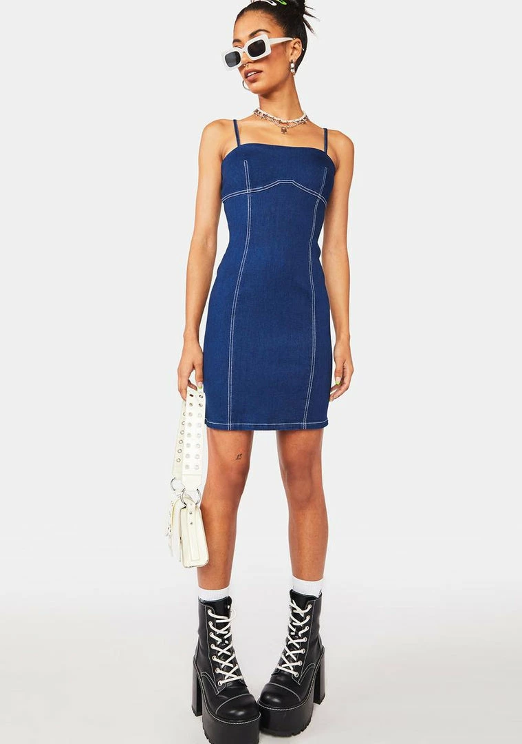 cuz you’re the one to watch. This denim mini dress has adjustable shoulder straps, a back zip closure, and contrast stitching all over.