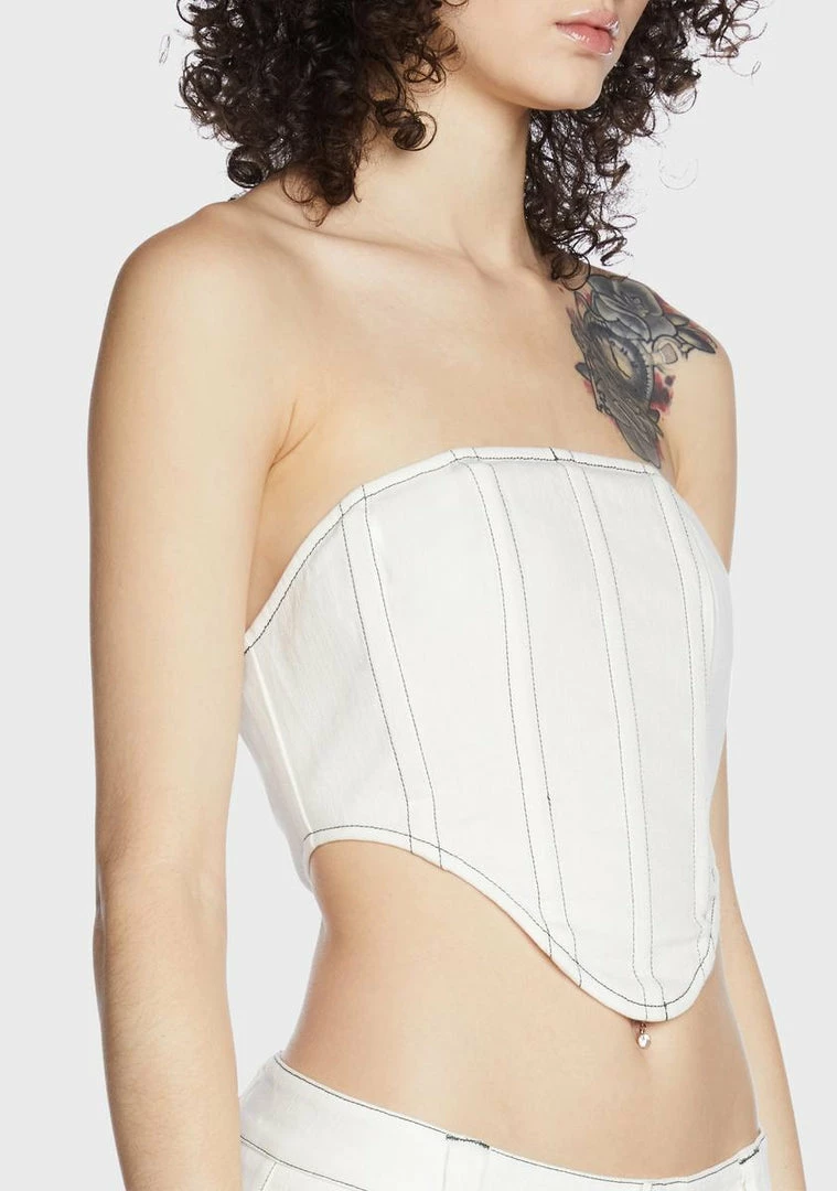 let your style speak for itself. This cropped corset top has a denim construction, contrast stitch detailing, a strapless neckline, a curved hem, and a back zip closure.