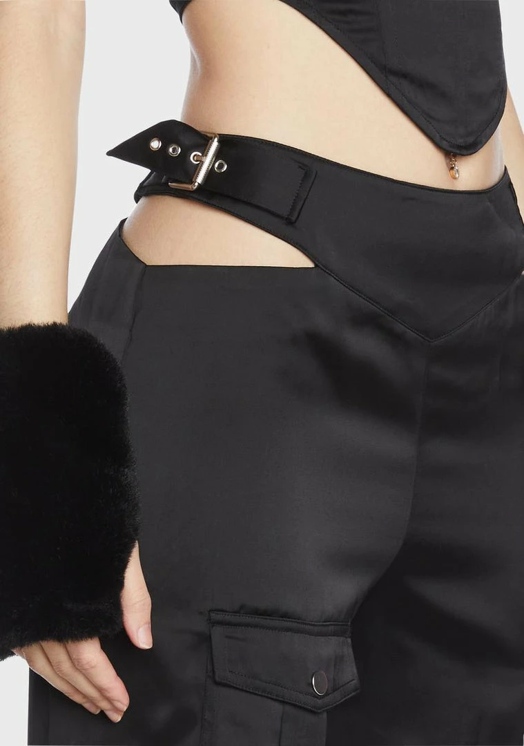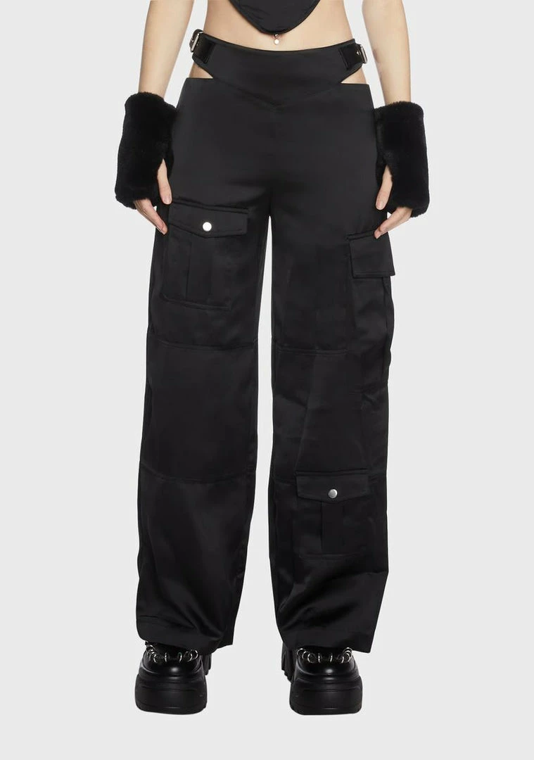 you want it, you got it! These mid-rise pants have side cutouts with buckle hardware, utility-style flap leg pockets with snap button closures, baggy legs, and a back zip closure.