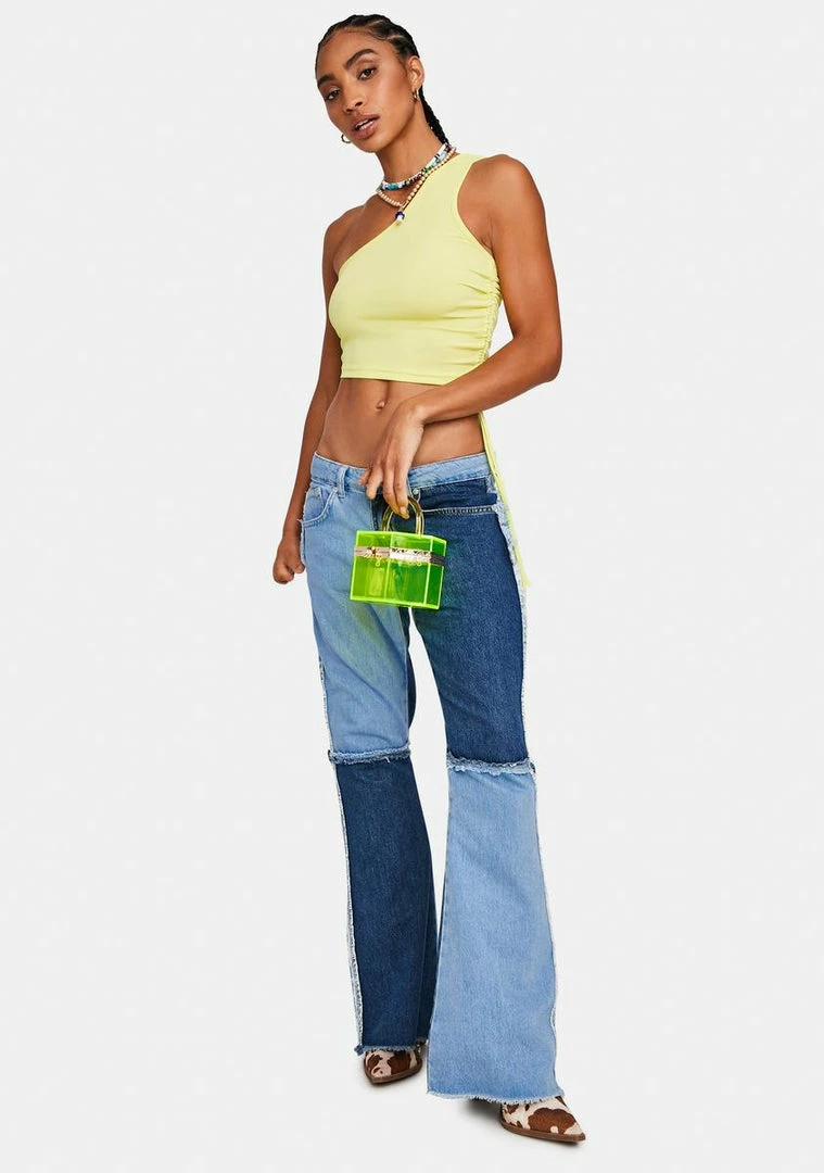 cuz you light up my life! This sunny crop top has a one shoulder design and a ruched cinch tie accent.