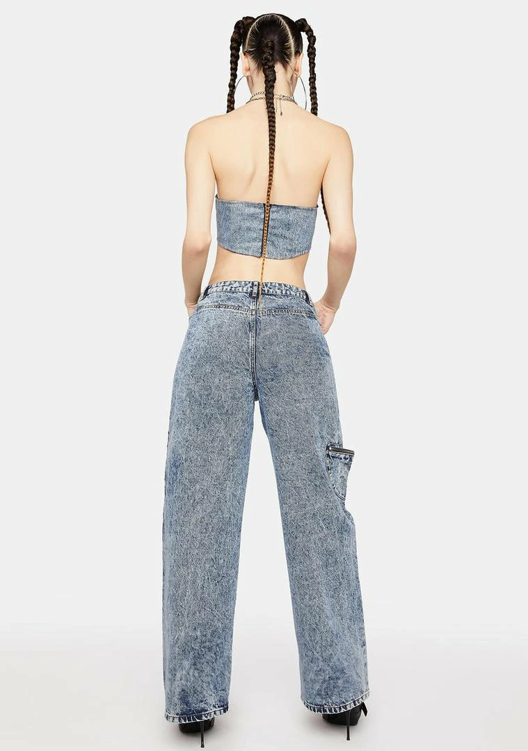 cuz you start trends. These jeans have a washed denim construction, pockets, cargo zipper pockets, a low rise fit, and a button and zipper closure.