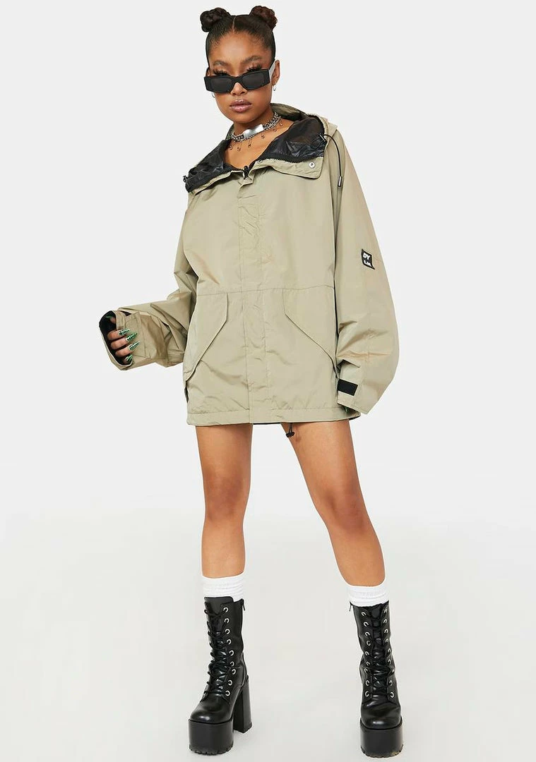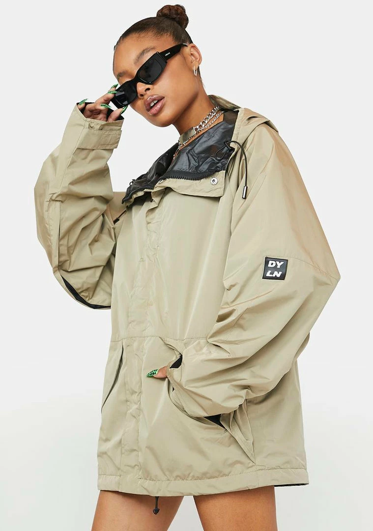 has an oversized fit, velcro straps on the wrist,dual pockets, adjustable drawstrings on the hem and hoodie, and zipper and stud closure on the front.