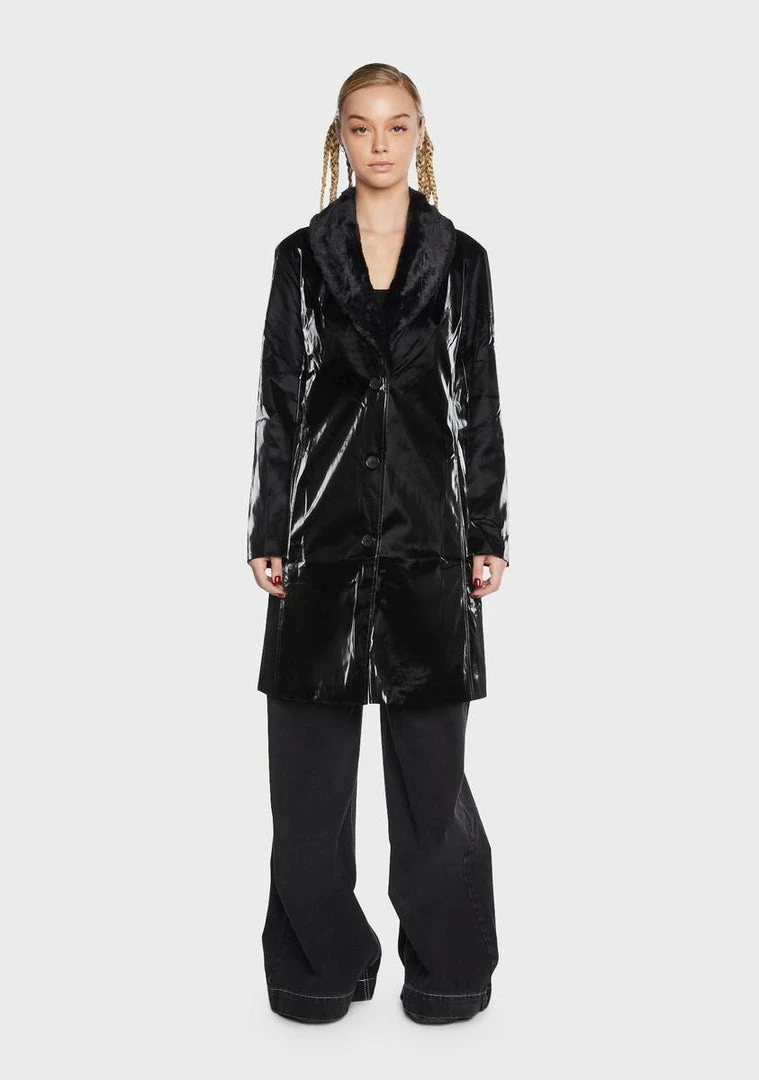cuz you’re too cool. This trench coat has a patent vegan leather construction, a faux fur collar, pockets on the sides, and front button closures.