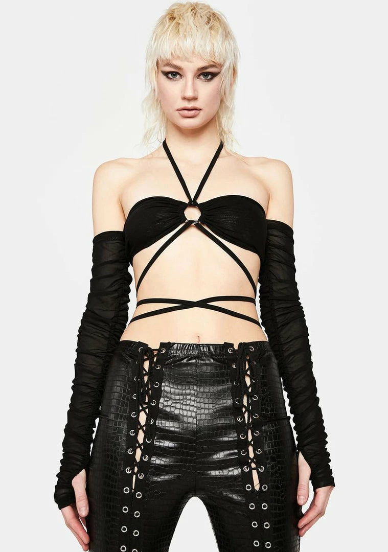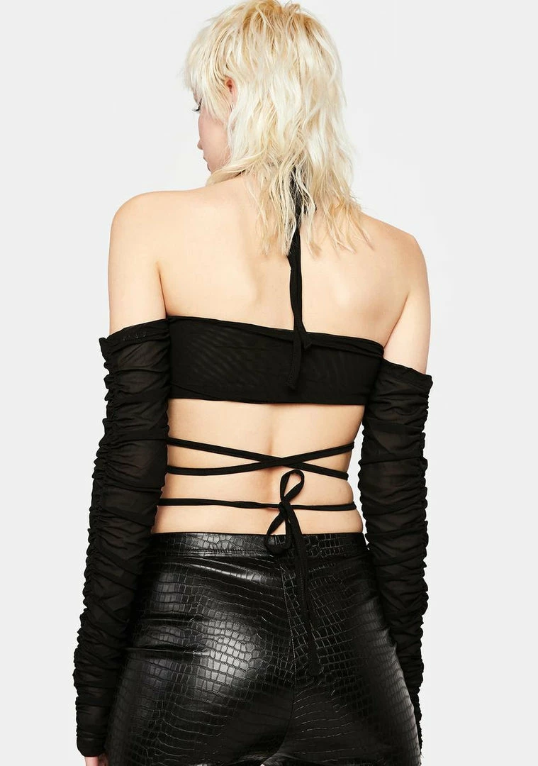 you’re so effortless! This crop top has a ruched mesh design, halter ties, an O-ring cutout between the bust, off-the-shoulder long sleeves with thumbhole cutouts, and strappy tie closures across the waist.
