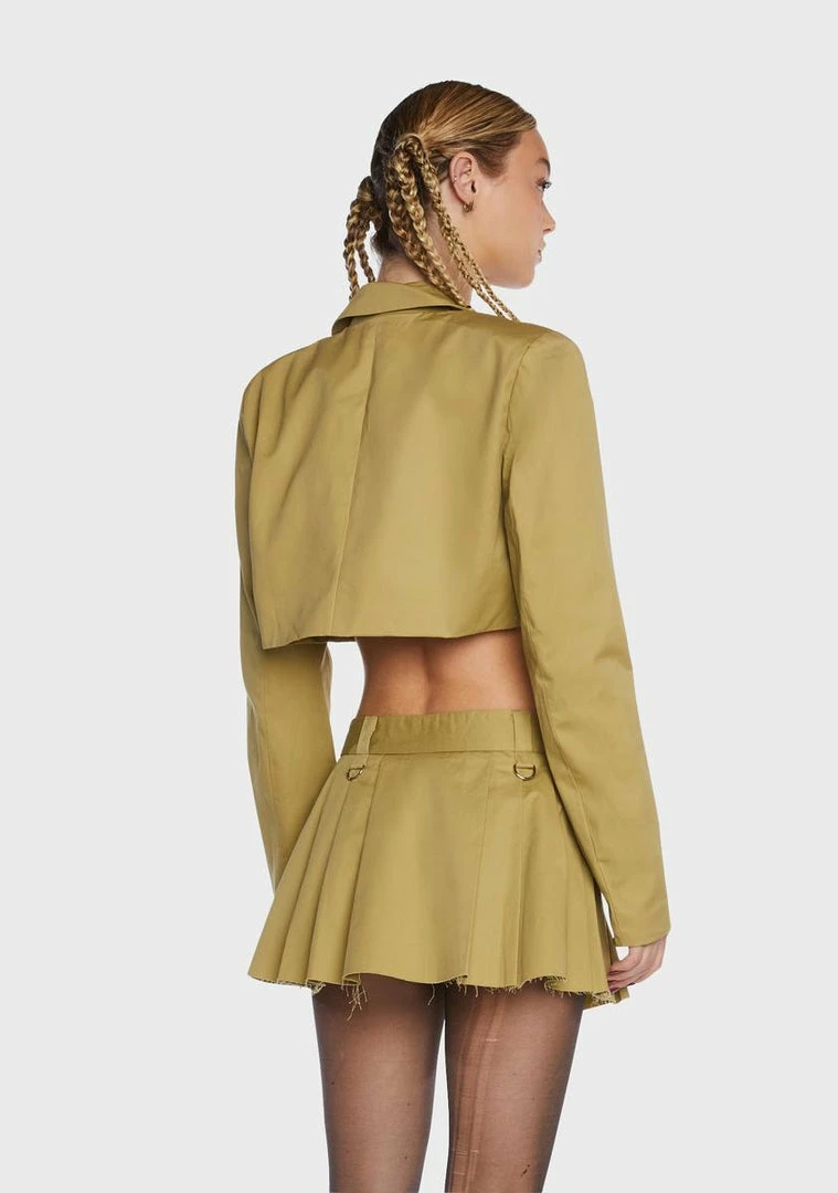 cuz you’re the real deal. This cropped blazer jacket has a twill construction with a full lining, padded shoulders, and utility pockets on the front with long strap details.