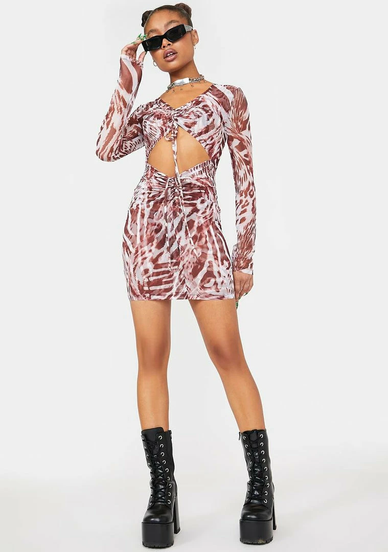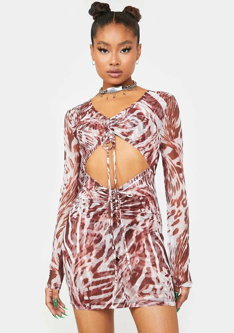 for that romeo in your life. This dress has a mesh construction,V- neckline,drawstring tie up on the front,midriff cut out design, and all over animal print.