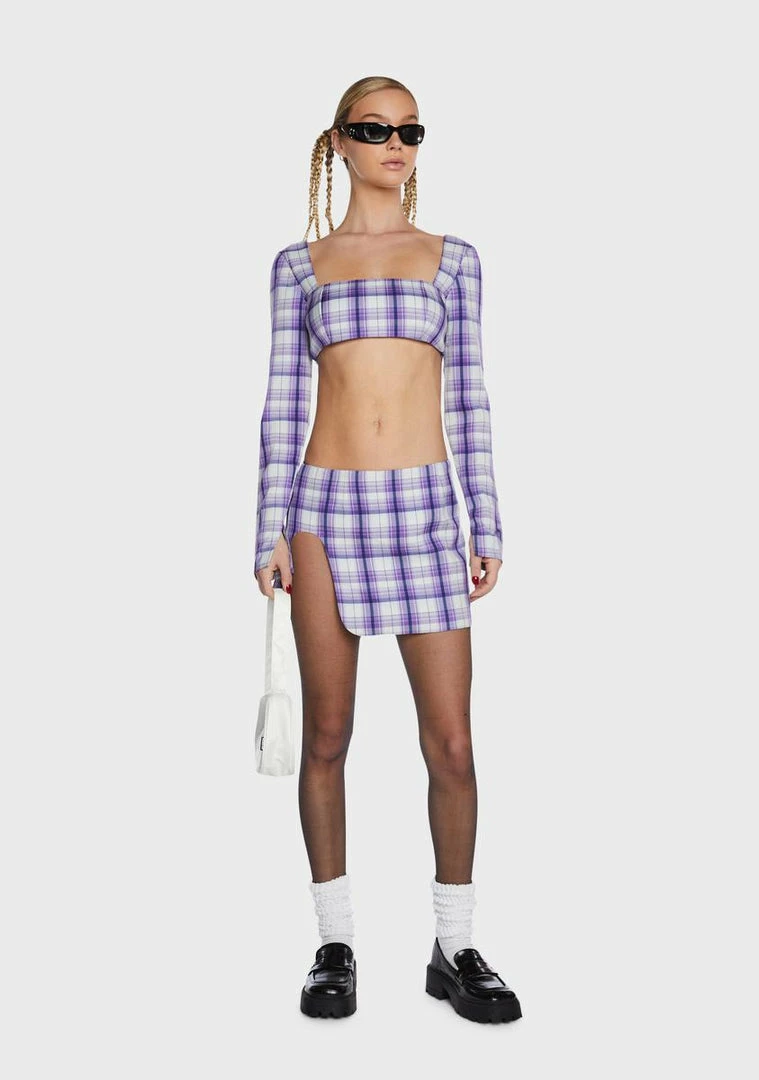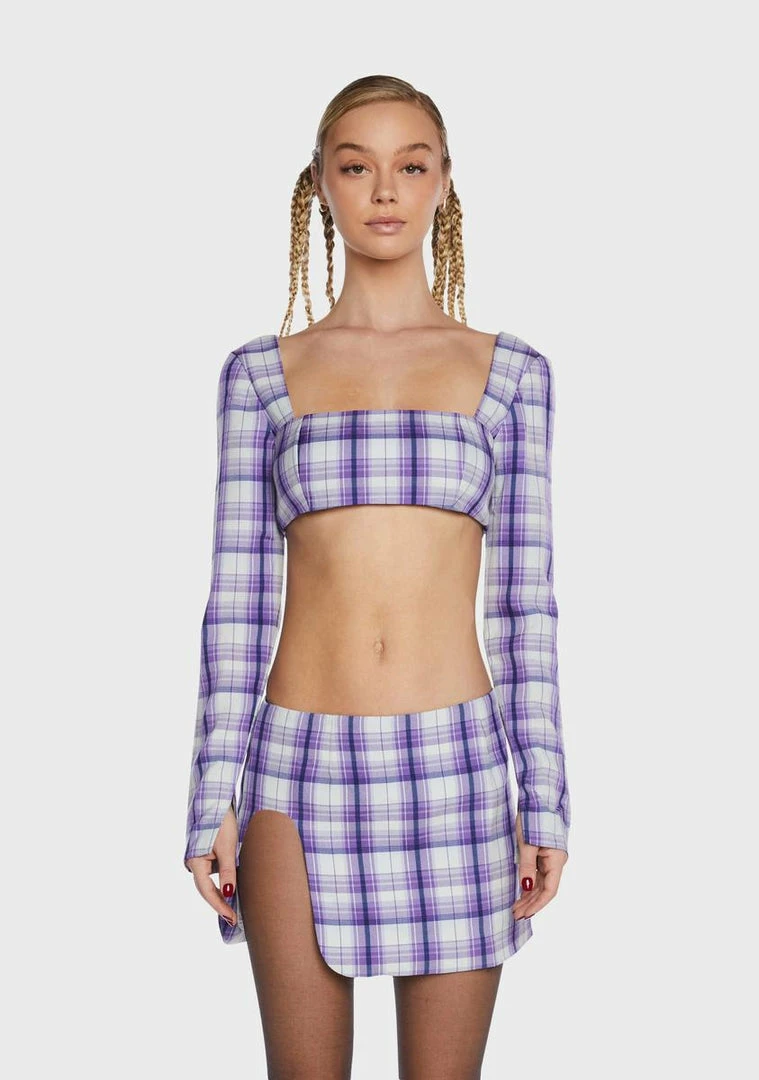 cuz you stay sassy. This long sleeve crop top has a soft suiting material, a square neckline, a back zip closure, and a plaid print all over.