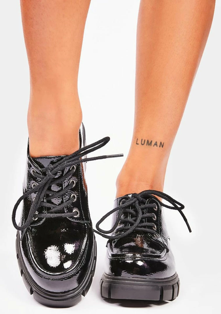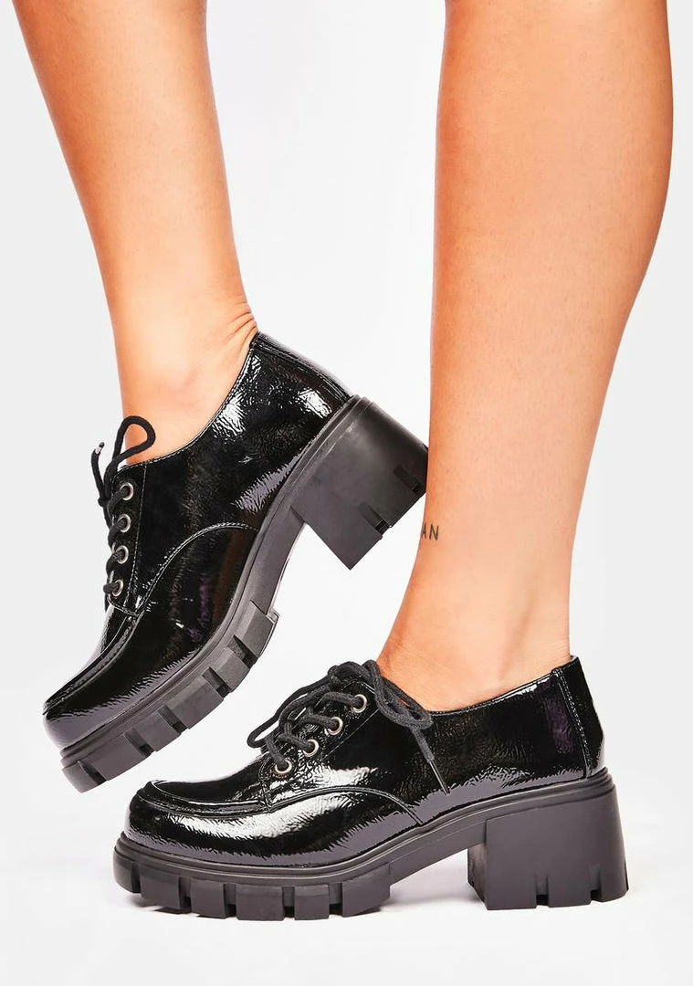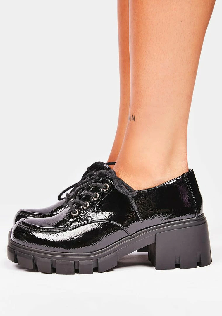 features a patent faux leather design, black lace up closures, rounded toes, and treaded platform soles.