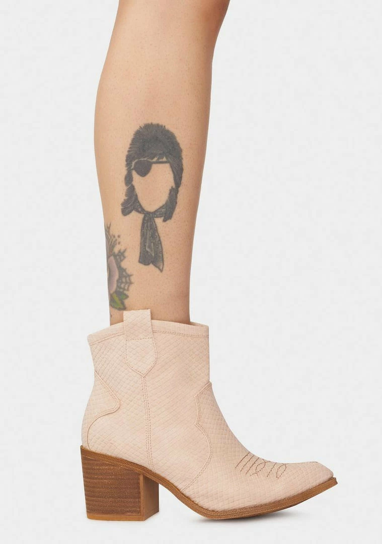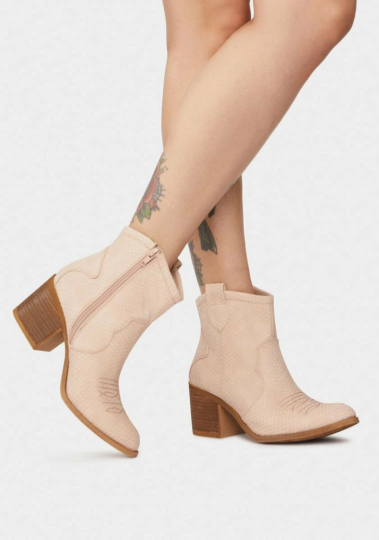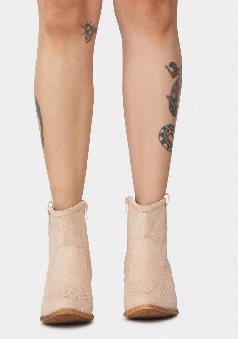 cuz youâre wild at heart. These cowboy boots have a vegan leather construction, side zip closures, a snake embossed pattern, and stacked heels.