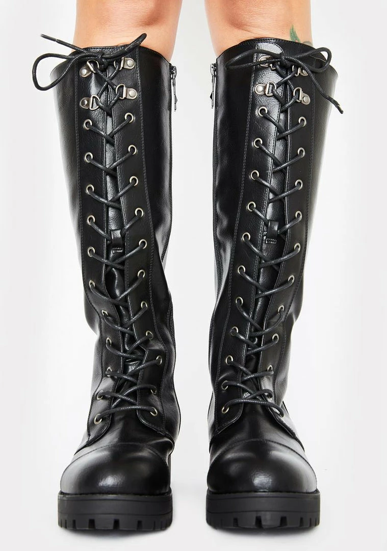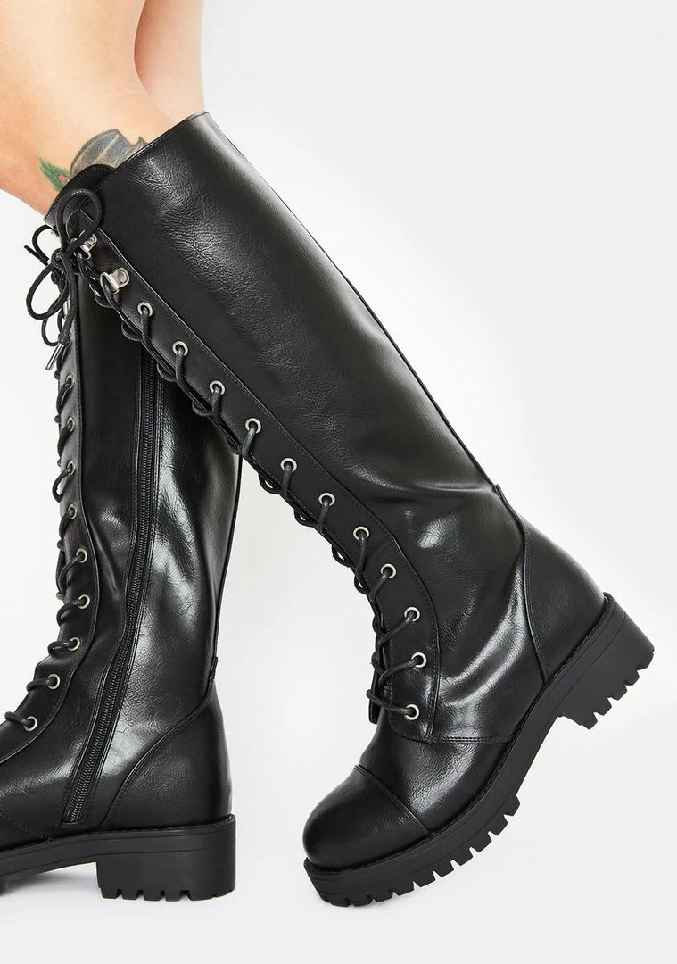 are you feelinΓ’ΒΒ lucky, punk? YouΓ’ΒΒre a smooth criminal in these knee high combat boots that have lace up fronts, smooth vegan leather construction NΓ’ΒΒ full zip side closures.