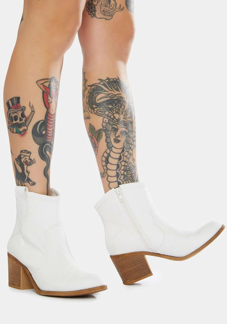 cuz youâre wild at heart. These cowboy boots have a vegan leather construction, side zip closures, a snake embossed pattern, and stacked heels.