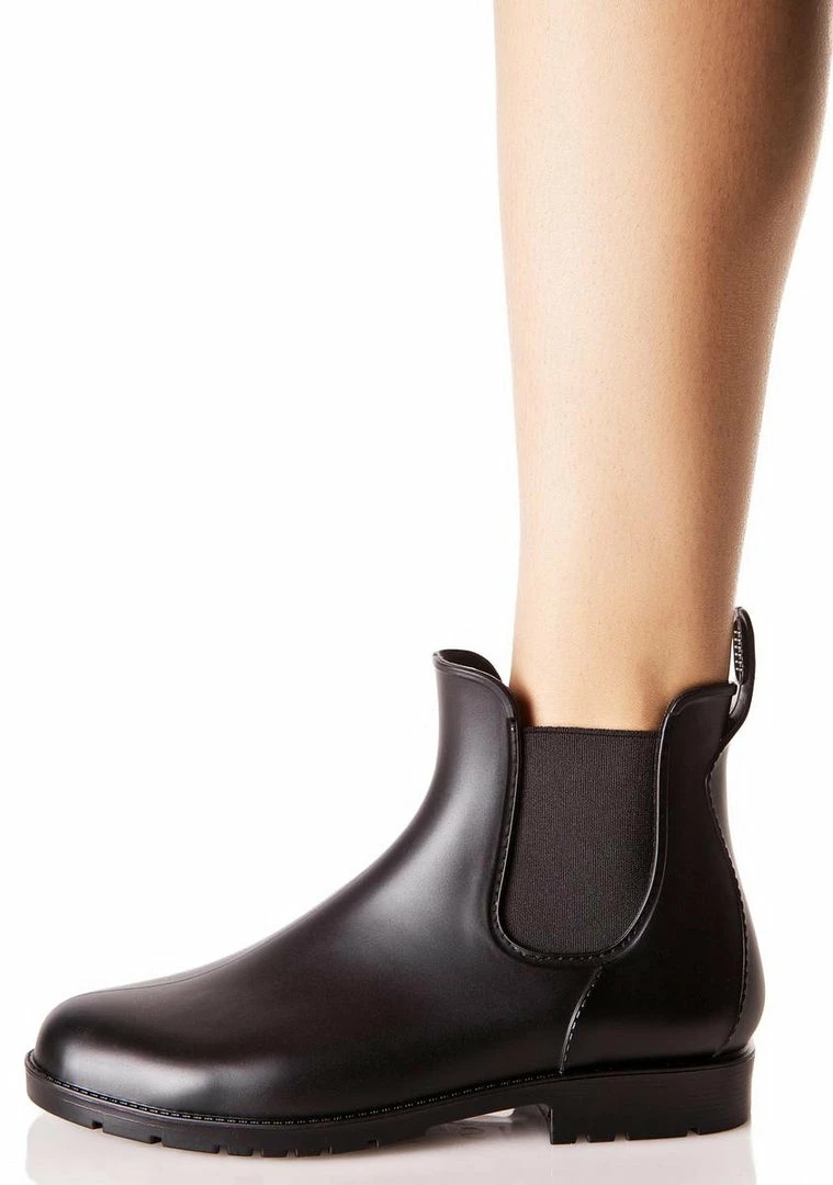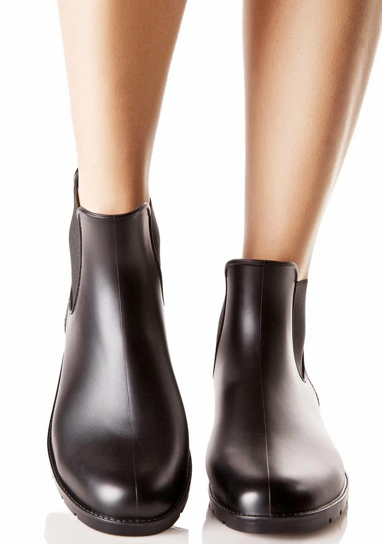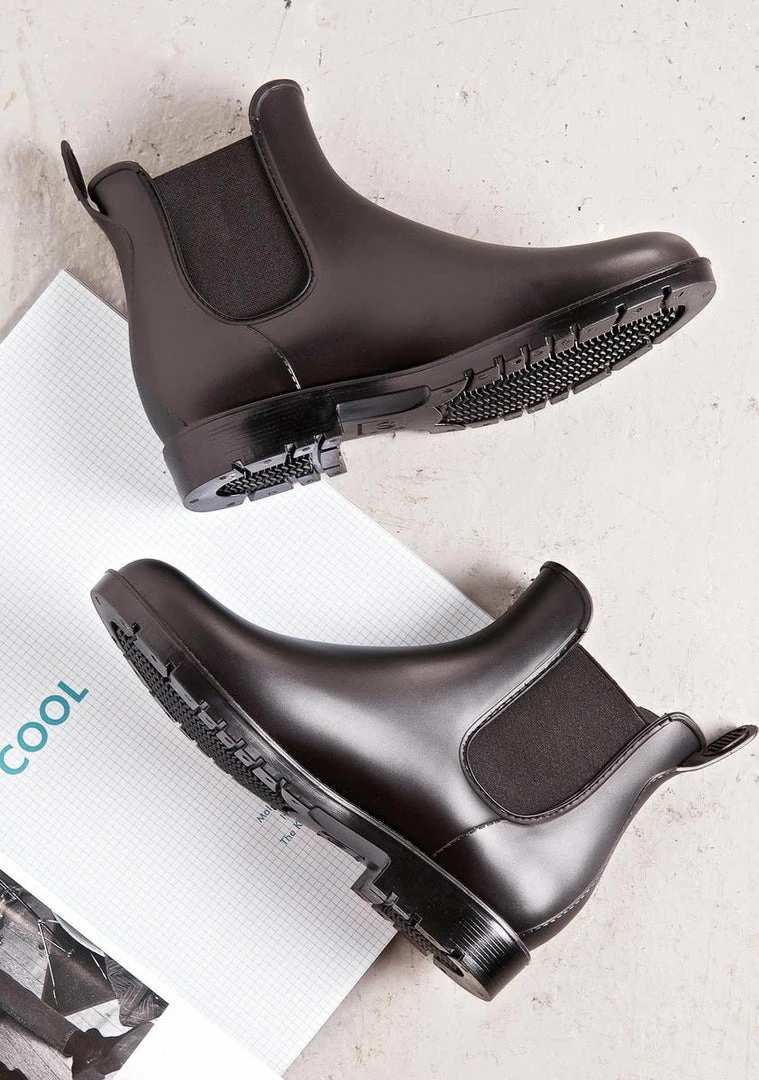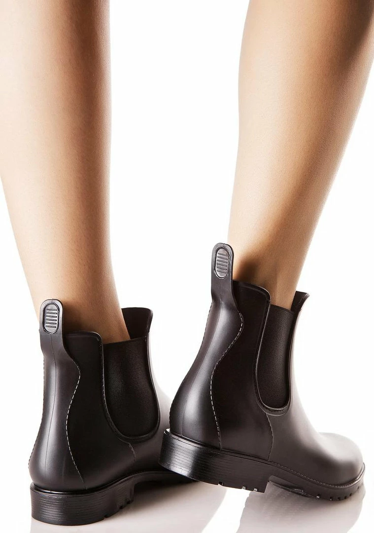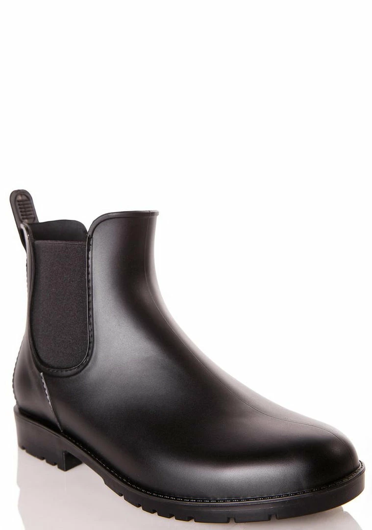 cuz ya always have fun, even on the gloomiest days! These cute ankle rain boots feature a matte black waterproof construction, pull tab, and thick elasticized sides for a comfy pull-on fit.