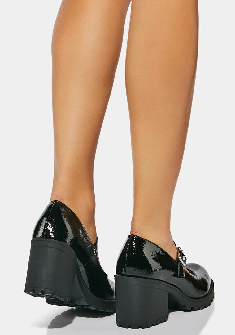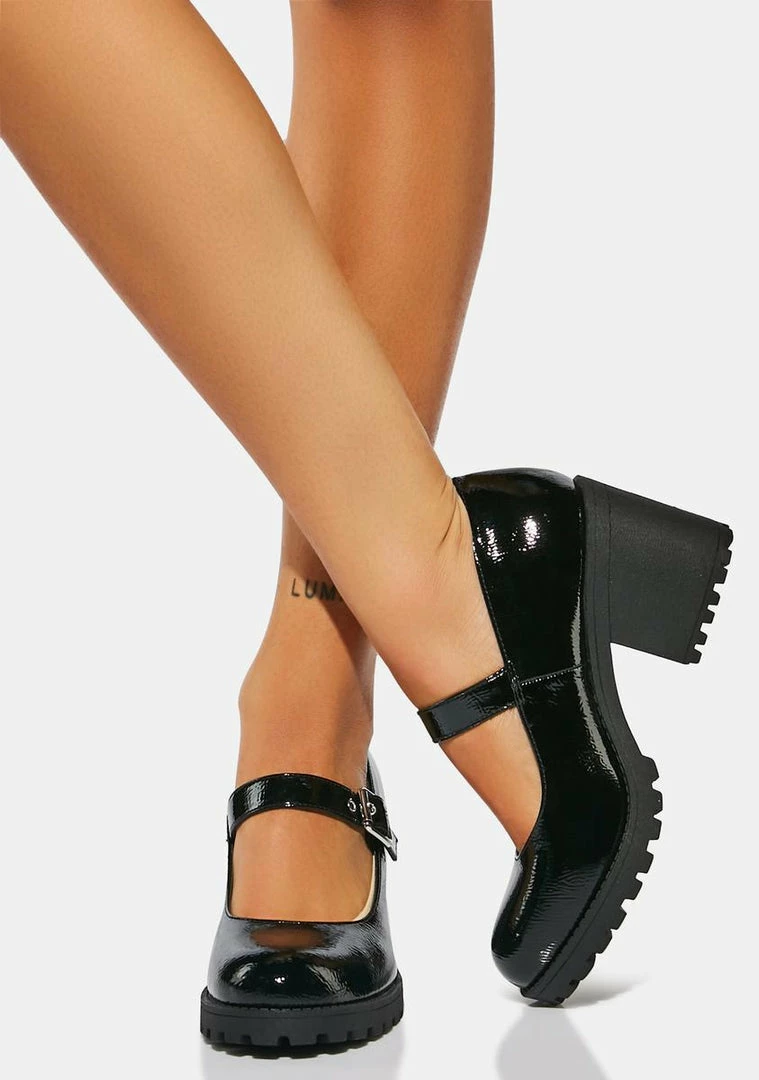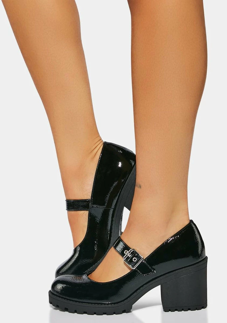 have a chunky heel and treaded sole, a patent vegan leather upper, and a buckle strap closure.