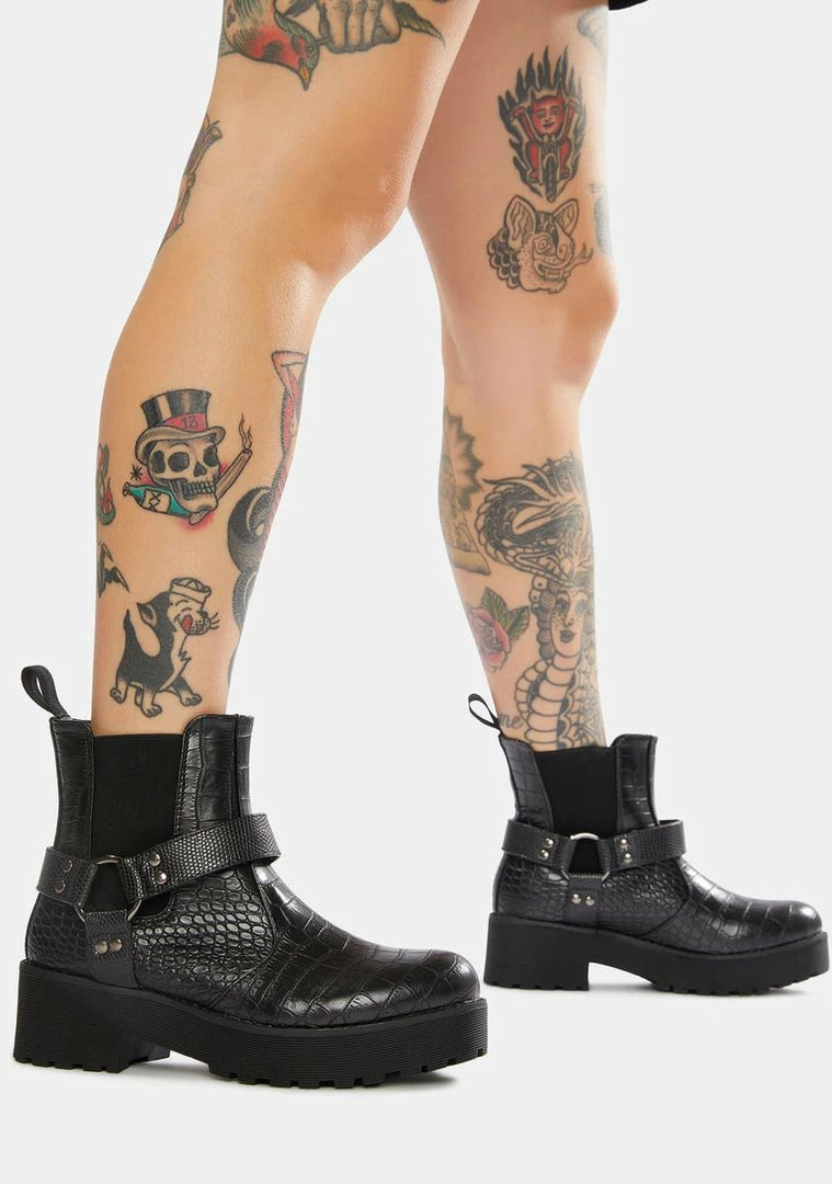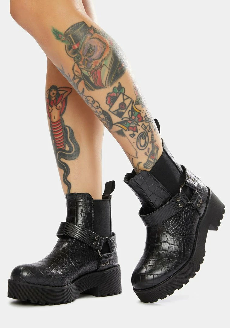 cuz you never stop. These vegan leather croc embossed moto boots have O-ring harness designs and elastic side gussets for an easy pull-on fit.