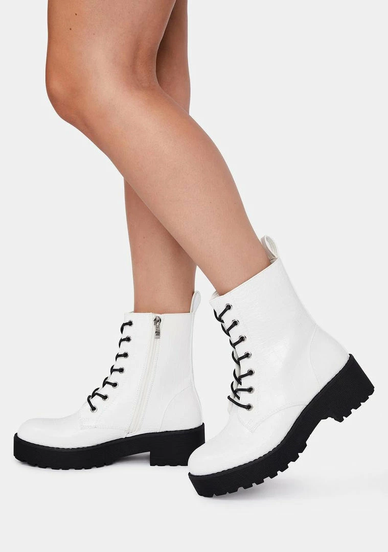 for sunday brunch with the besties. These platform combat boots have contrast soles and laces and a side zip closure.