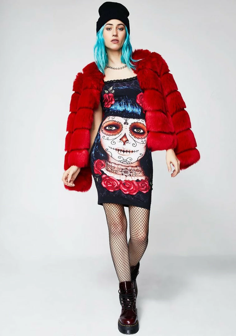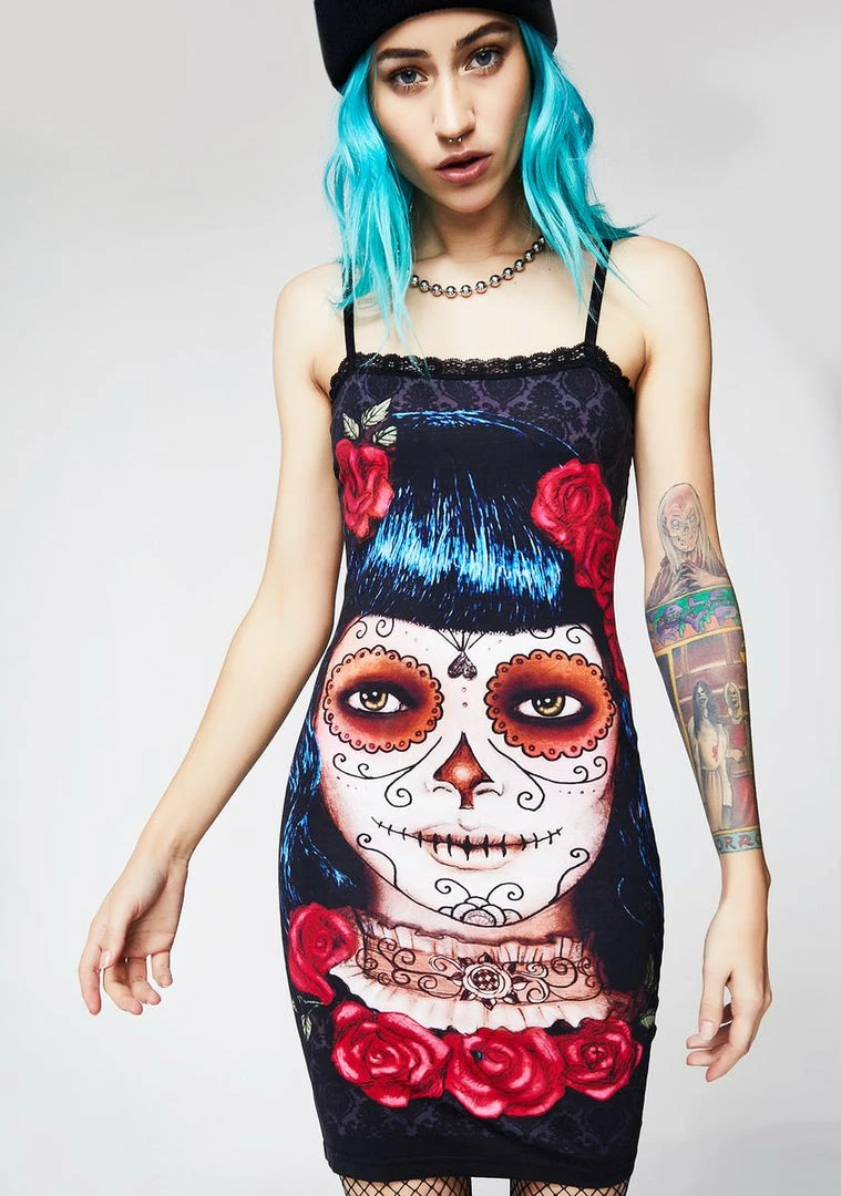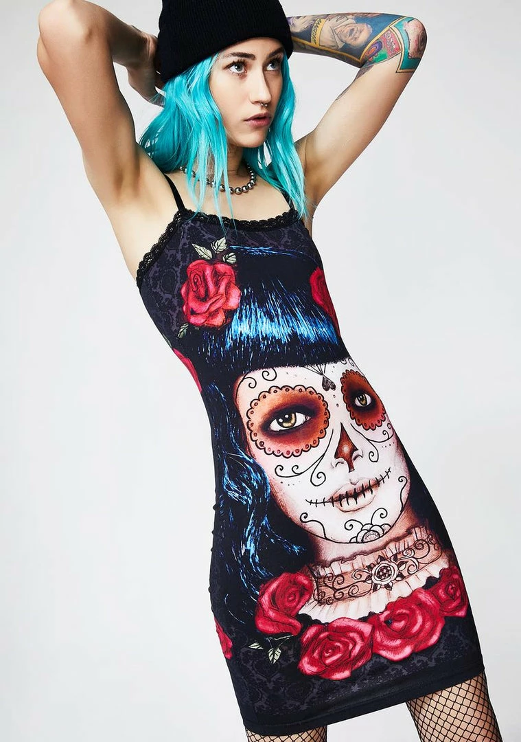 cuz theyรขยยre dying to see you. This black bodycon mini dress has a lace trim neckline and a sikk sugar skull decorated dame graphic on the front.