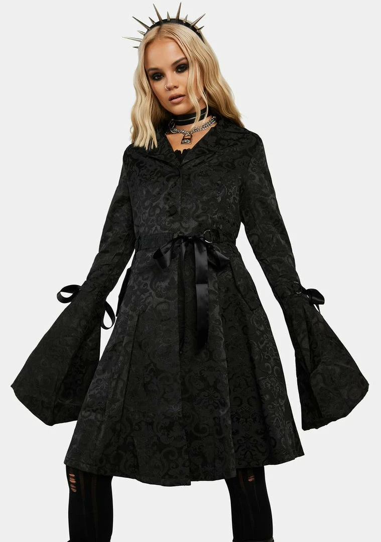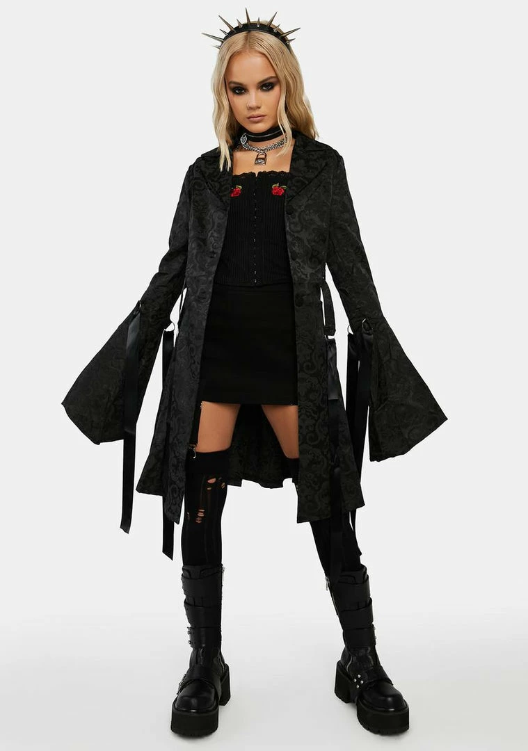 cuz the devil’s in the details. This knee-length jacket has a luxurious jacquard construction, adjustable waist and sleeve ties with O-rings, side pockets, extra-long flared sleeves, and a lapel collar.