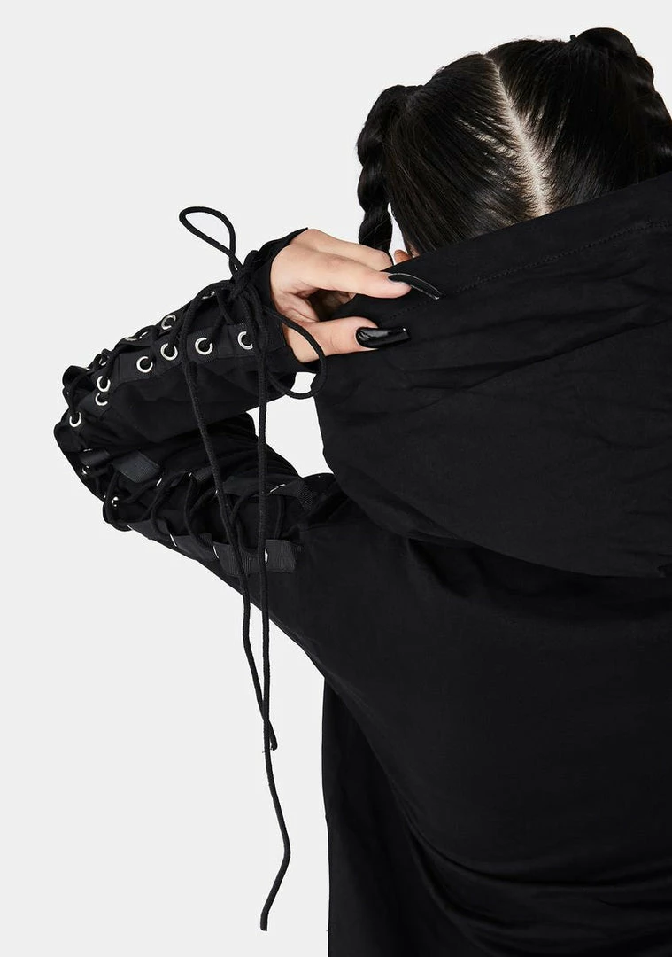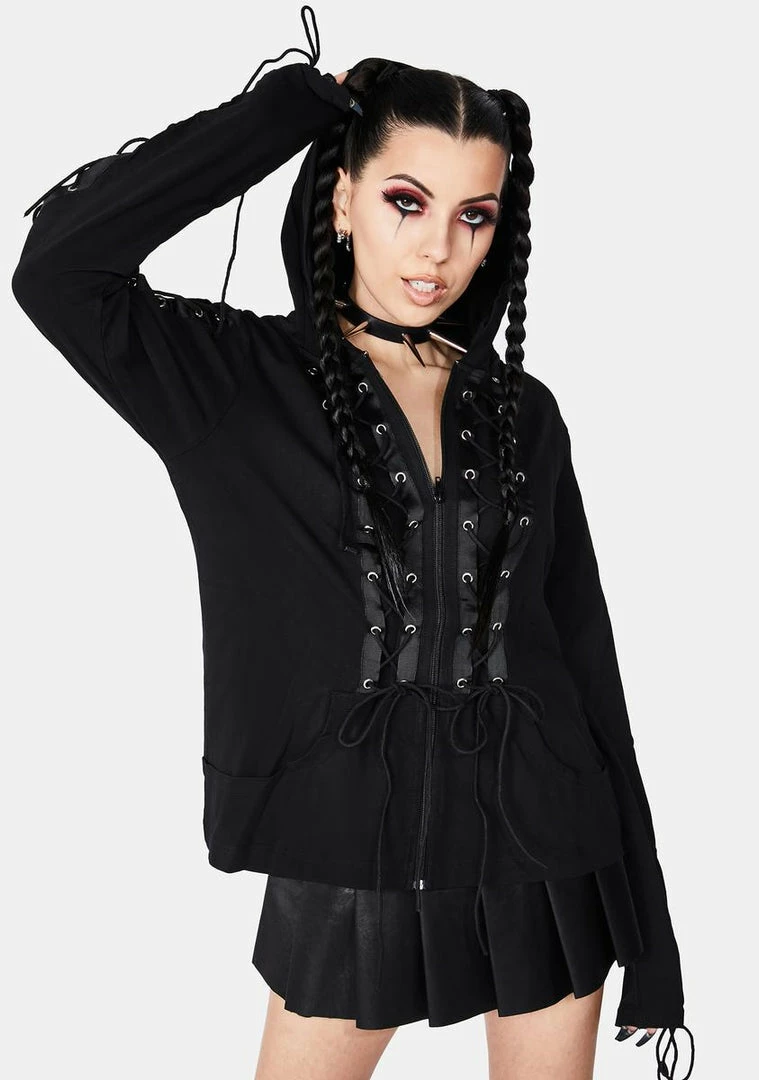 for diving into the darkness. This zip up hoodie has lace up accents all over, a soft knit feel and a zip up closure in the front.