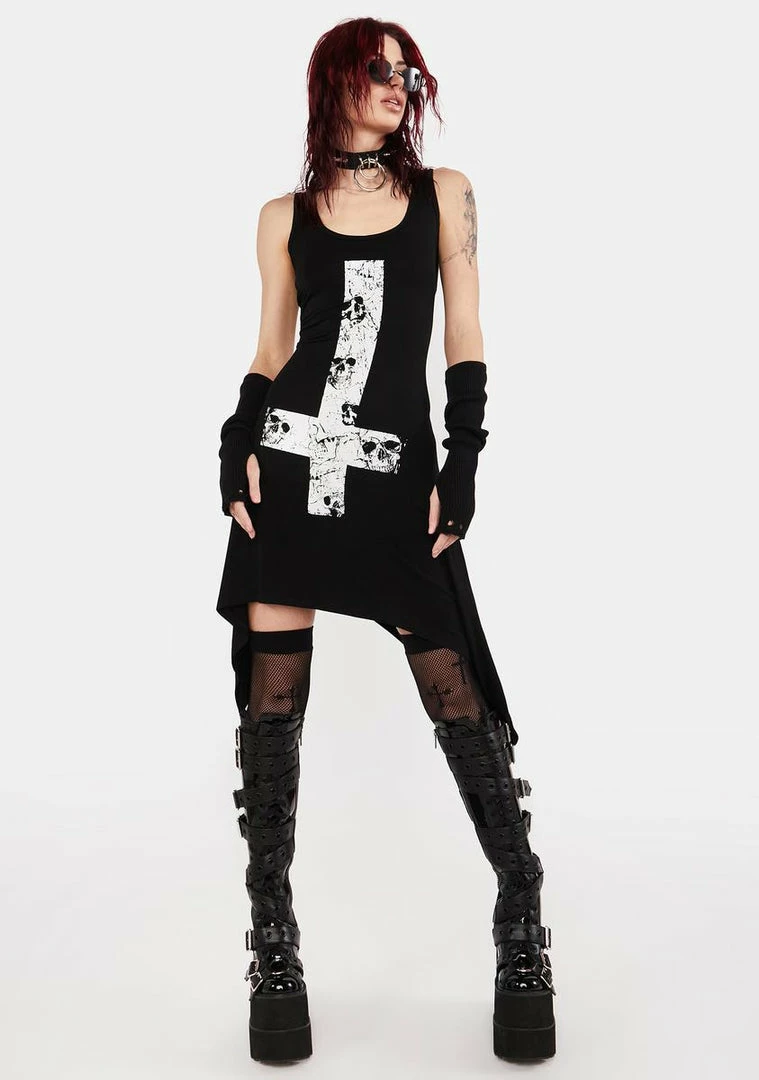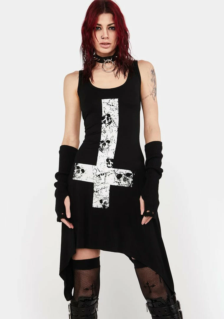 cuz looking good is your cross to bear. This mini dress features an inverted cross and skull graphic at front, adjustable lace-up ties at back, and an asymmetric hemline.