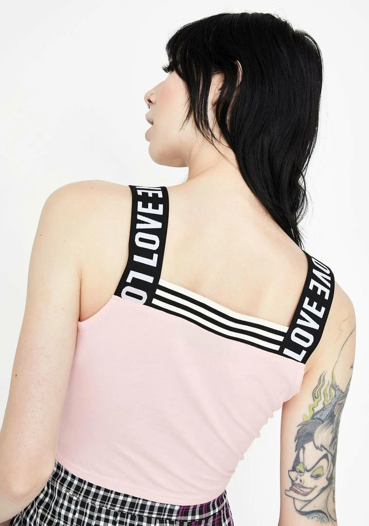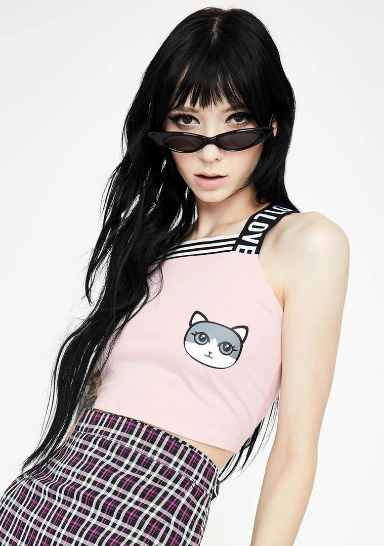 cuz you’re just too purrrfect, babe! Keep it cute in this crop tank top that has kitty patches on the front, ‘love’ logo tape trim on the straps, and contrast stripe patterns.