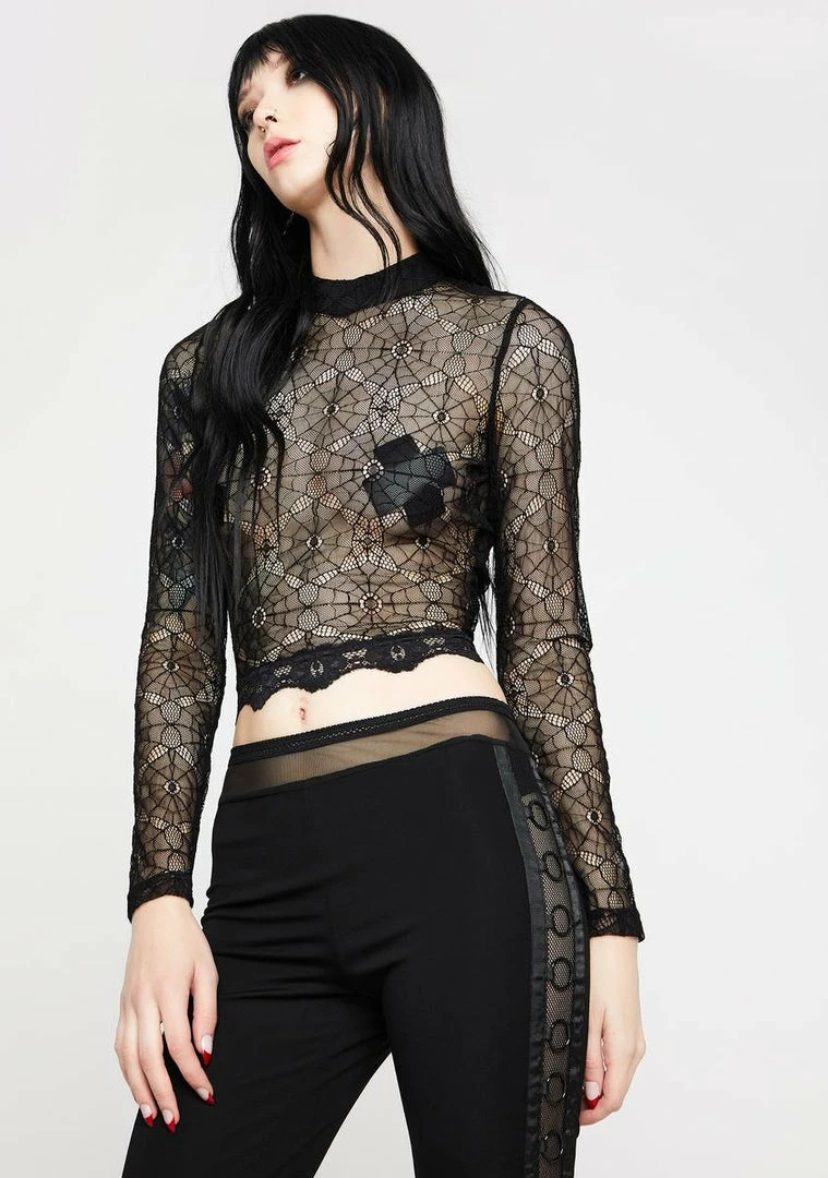 cuz you are see it clearly. This crop long sleeve top is fishnet with a spider web design and lace detailing.