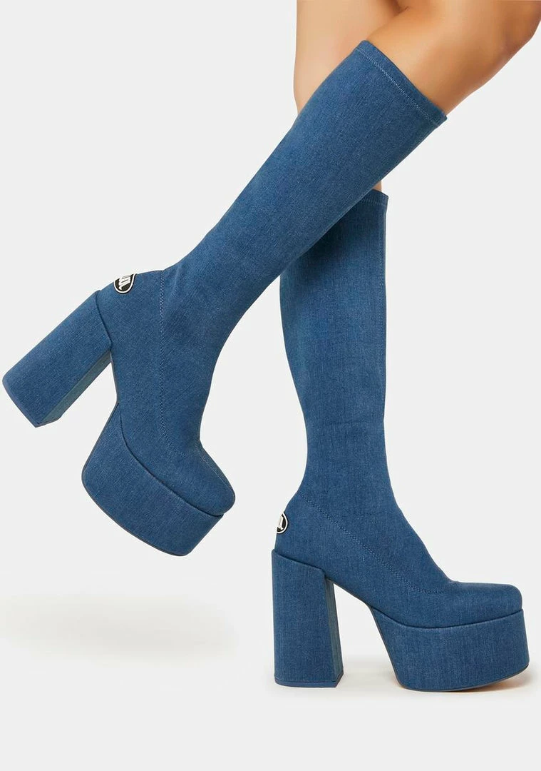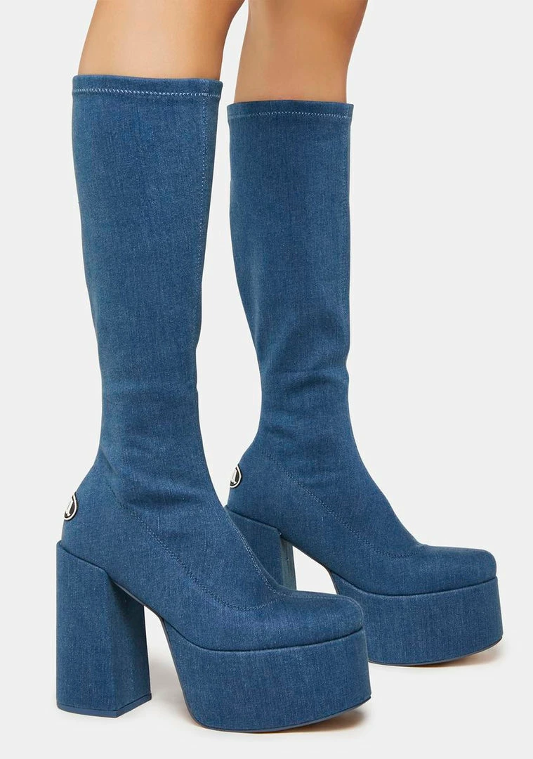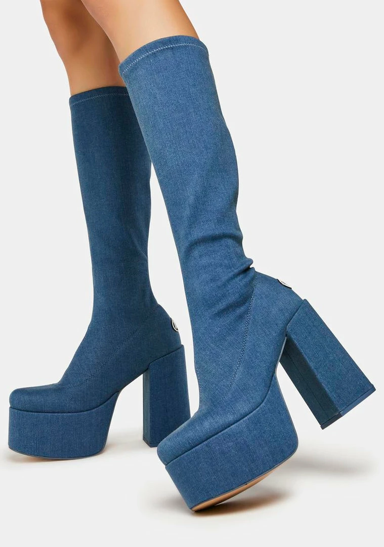 get glam for the ‘gram! These knee-high boots have a stretchy denim construction, pull-on styling, block heels, and chunky platforms.