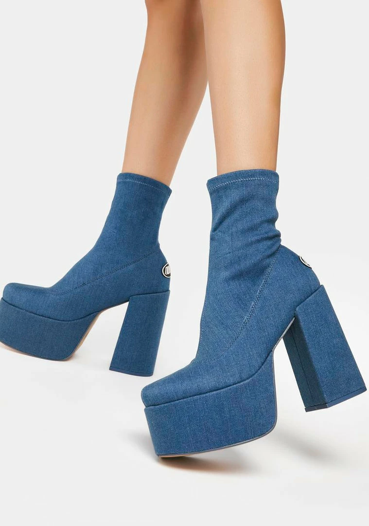 cuz you secured the bag. These ankle boots have a stretchy denim construction, sock boot-style shafts, chunky platforms, and block heels.